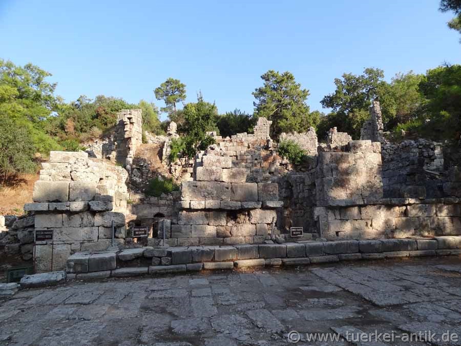 Die Theater-Therme in Phaselis, auch "Kleines Bad" genannt, befindet sich auf der Ostseite des zentralen Marktplatzes, unterhalb des Theaters. Anhand der Ausführung des Hypocaustsystems lässt sich seine Entstehungszeit in die Zeit um das 1. Jh. n. Chr. datieren. Es wird angenommen, dass es sich um ein Privat-Bad handelte, also der breiten Öffentlichkeit nicht zur Verfügung stand. Das große, öffentliche Bad mit direktem Anschluß an den Aquädukt befand sich in ca. 50 Meter Entfernung auf der Westseite der Hauptstraße. |