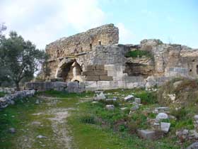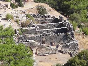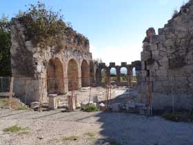 Die Theater-Therme in Phaselis, auch "Kleines Bad" genannt, befindet sich auf der Ostseite des zentralen Marktplatzes, unterhalb des Theaters. |