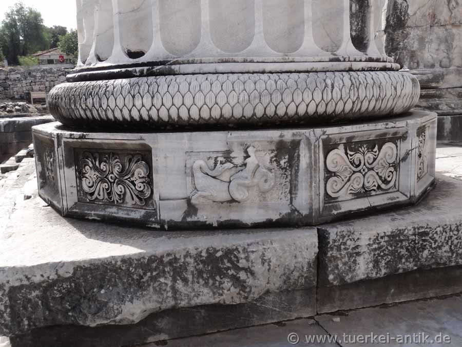 The columns stood on richly profiled bases decorated with reliefs in the front row. The crowning glory are ionic capitals of the people. The capitals of the corner columns are unique. One still shows remains of the figures of Artemis and Leto, the other (in the archaeological museum in Istanbul) shows Zeus and Apollo, each between lion grips and bull heads. |