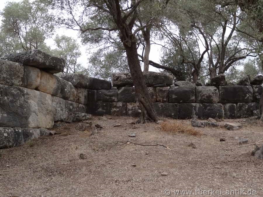 Only a few remains of the former city can be seen today. Parts of the city wall, remains of a theatre and an agora can be seen near the theatre. There are some graves in the surrounding area. The theatre hasn't been excavated yet. At present, only a few rows of seats can be seen. |
