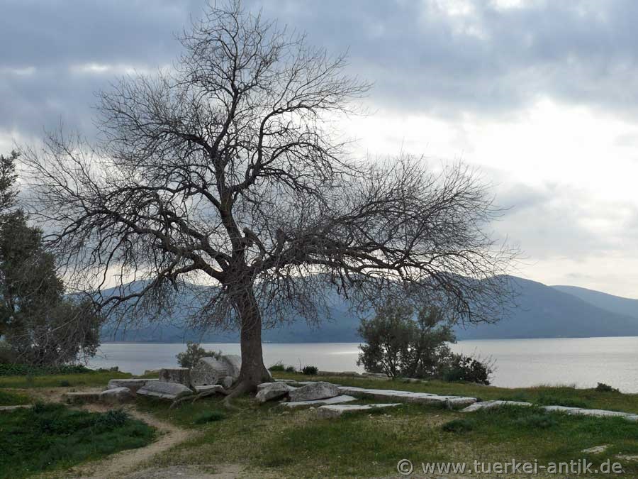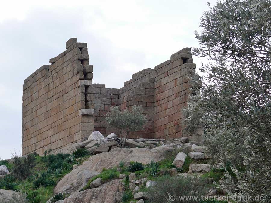 The 6.5 km long, 2-3 m wide walls, some 6 m high and reinforced with 65 towers, are an excellent example of Hellenistic fortifications. Also known are the Agora (forecourt of today's village school) and an Athena temple west of it.