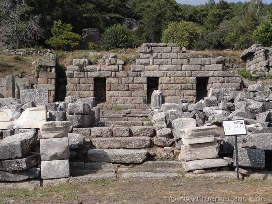 The remains of the cyclope-like masonry of the sanctuary stand about 700 metres above sea level on a platform halfway away from the valley and rise in front of a rock face split by a prehistoric lightning strike. From Mylasa an extended procession road led to the complex, which is still visible from the city today. |