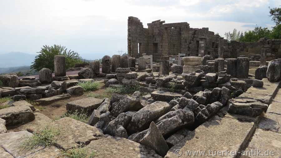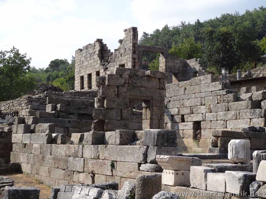 At the place of a small temple from the beginning of the 5th century B.C., King Maussolos ordered the construction of a larger marble temple in Labraunda in 377 B.C., which was completed after another reconstruction in 344 B.C.. It was a so-called ring hall temple (peripteros) of Asia Minor-Ion building regulations with six columns each on the narrow sides and eight columns on the long sides.