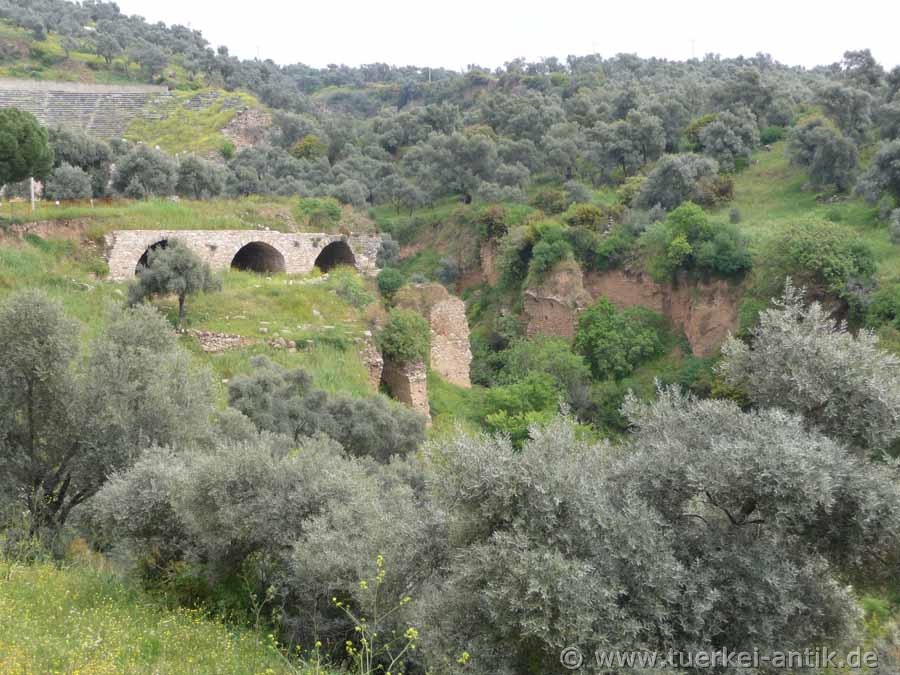 The city is divided into two parts by a stream gorge. Of archaeological remains, the bridge at Nysa is particularly noteworthy, an approximately 100-metre-long superstructure of the deep stream gorge, which served as a substructure for the theatre forecourt and is considered to be the second longest of its kind in ancient times. In front of the late Hellenistic-Roman theatre on the left side of the gorge are the still unexcavated remains of an "amphitheatre". Only a few rows of seats, mostly overgrown by grass, have survived. According to the latest findings, however, the oval ground plan is a stadium. |