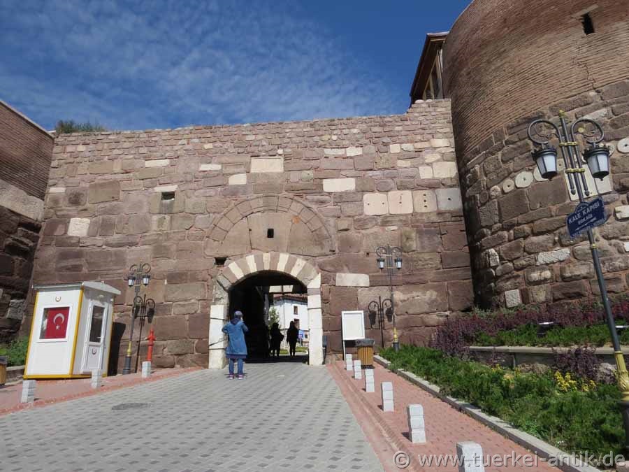 25 v. Chr. wurde Ancyra Hauptstadt der römischen Provinz Galatien. Während der römischen Herrschaft wurde die Zitadelle als Heerlager genutzt. Bei der Teilung des Römischen Reiches nach dem Tode des Kaisers Theodosius I. im Jahr 395 fiel die Stadt an das Oströmische Reich, das später Byzantinisches Reich genannt wurde. Aus dieser Zeit stammen die eindrucksvollen Befestigungsmauern, in denen Spoilen, darunter Säulentrommeln und Grabsteine, römischer Herkunft verbaut wurden. |