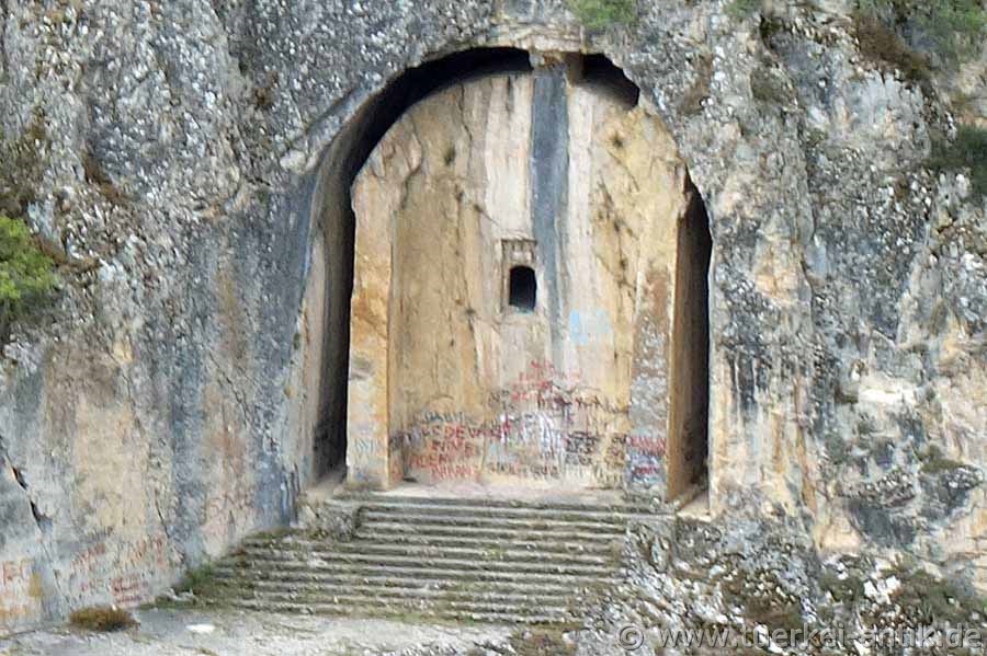 Das hellenistisches Felsengrab des Kommandanten IKEZİOS aus dem 2. Jh. v. Chr. befindet sich etwa 27 km nördlich von Çorum in einem steilen, felsigen Tal. |