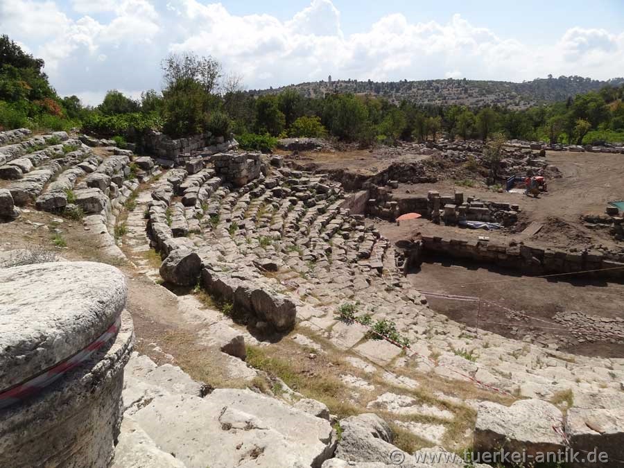 Das vor noch nicht allzu langer Zeit ausgegrabene Theater fasste 2000 Zuschauer. Es liegt links vor dem Prunktor. Die Sitzreihen wurden in den Stadthügel gebaut, während der obere Teil aus großen, z.T. noch erhaltenen Steinblöcken erbaut wurde. Das Bühnenhaus ging im Laufe der Zeit leider gänzlich verloren. Die Steine finden sich z.T. in den Häusern von Uzuncaburç wieder. Auf einem der erhaltenen Simssteine des Bühnenhauses ist eine Inschrift angebracht, aus der hervorgeht, dass das Theater in der Regierungszeit von Kaiser Marcus Aurelius (Kaiser von 161-180 n.Chr) und Lucius Verus (161 - 169 n.Chr.) erneuert wurde.