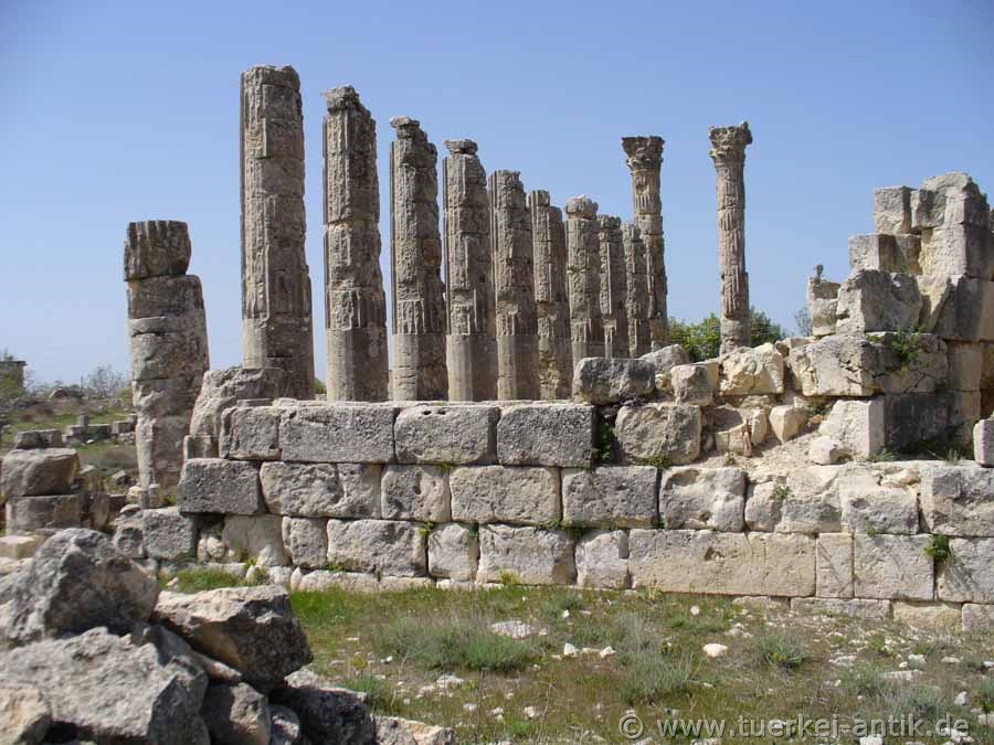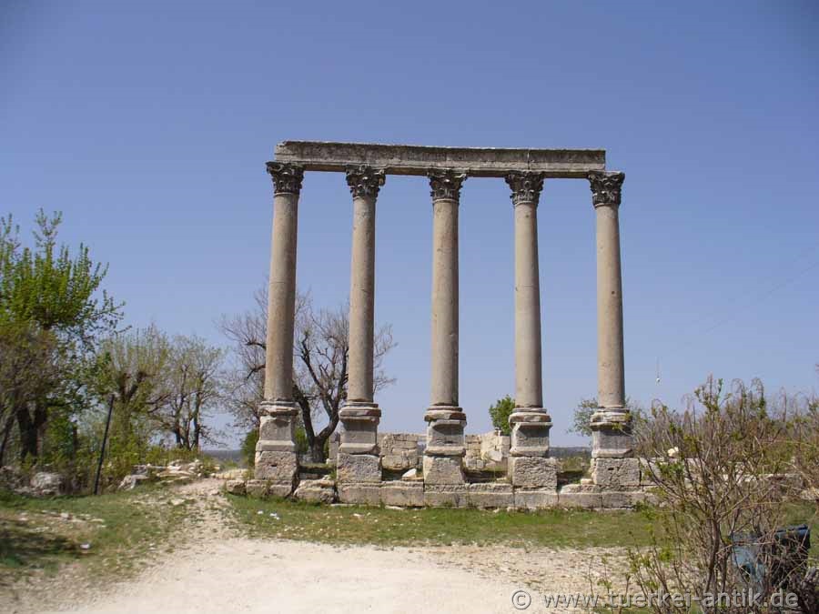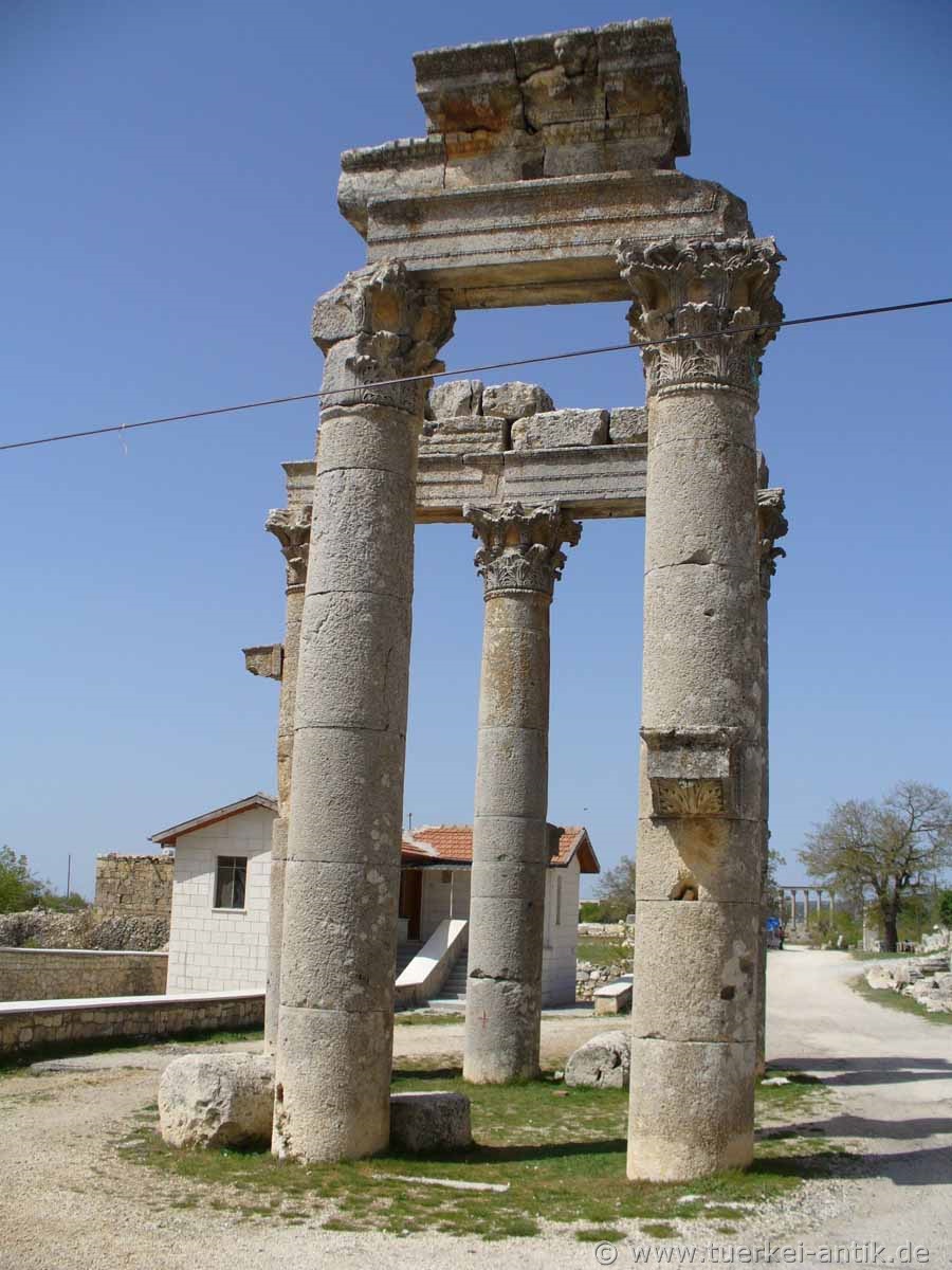 Man betritt das Stadtgelände durch ein Prunktor, von dem noch fünf Säulen erhalten sind. Dahinter führt eine Kolonnadenstraße vorbei am Zeus-Olbios-Tempel zum Tempel der Tyche. Von diesem sind ebenfalls noch fünf Granitsäulen mit korinthischen Kapitellen vorhanden, die durch mächtige Architrave mit Weiheinschriften verbunden sind.
