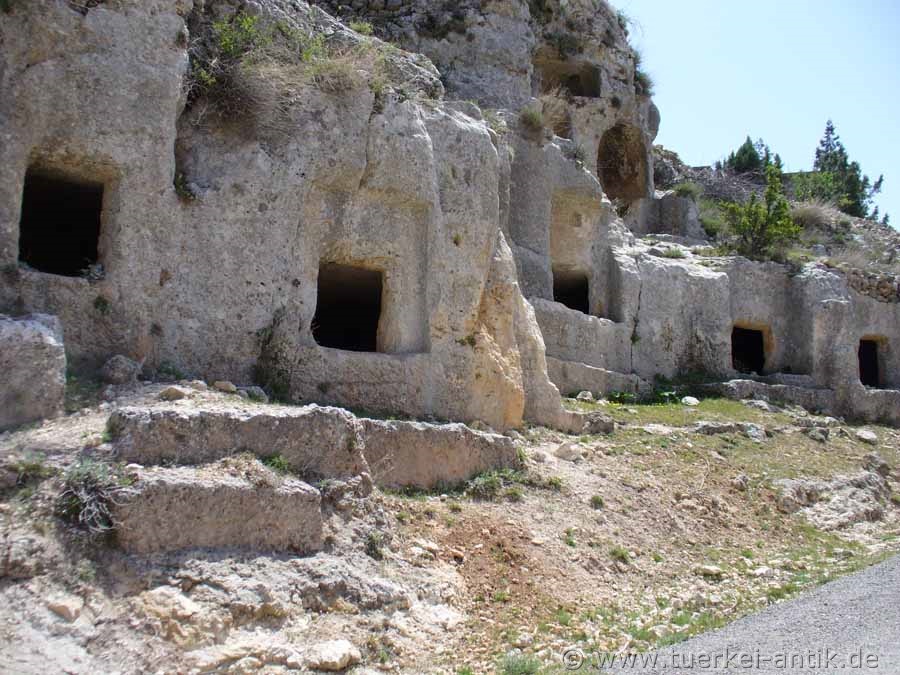 Um das Stadtgelände verteilt liegen mehrere, teilweise sehr umfangreiche Nekropolen. Etwa vier Kilometer entfernt beim heutigen Dorf Ura war der einstige Wohnbereich, die eigentliche Stadt Olba. Dort sind neben einem Theater, einem Nymphäum und einem Aquädukt ebenfalls zahlreiche Felsgräber zu sehen. (siehe auch die separate Seite Olba)