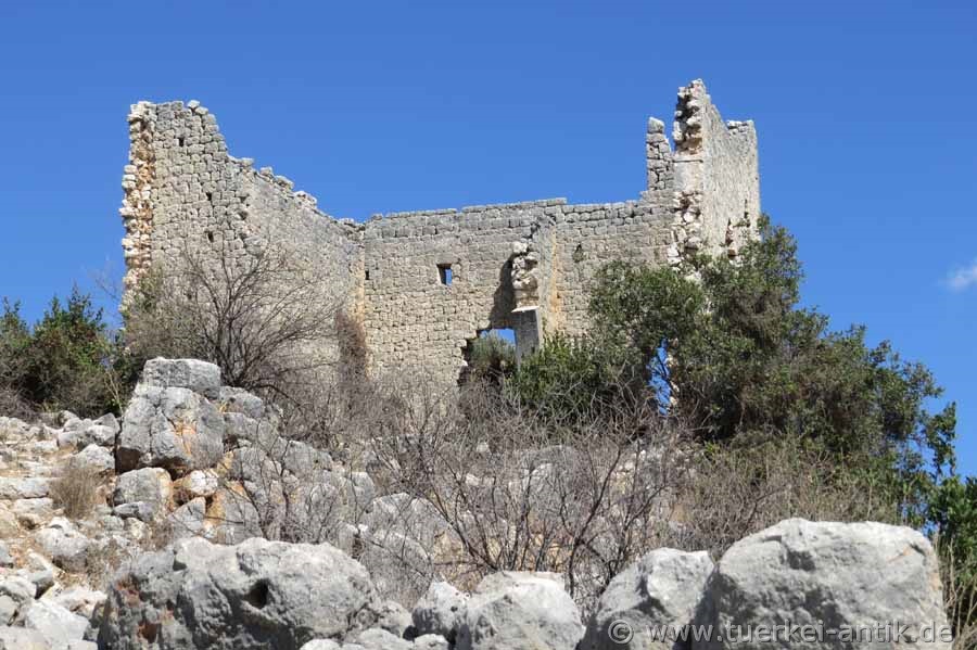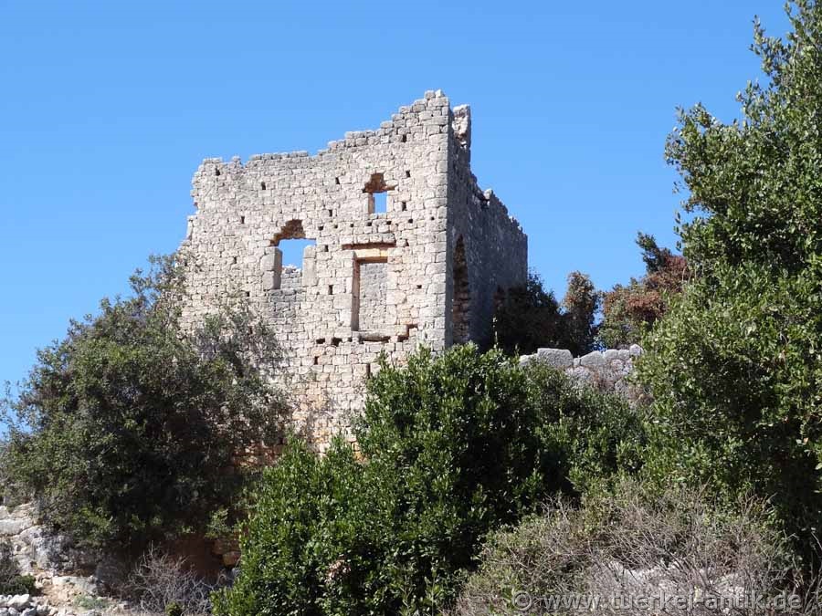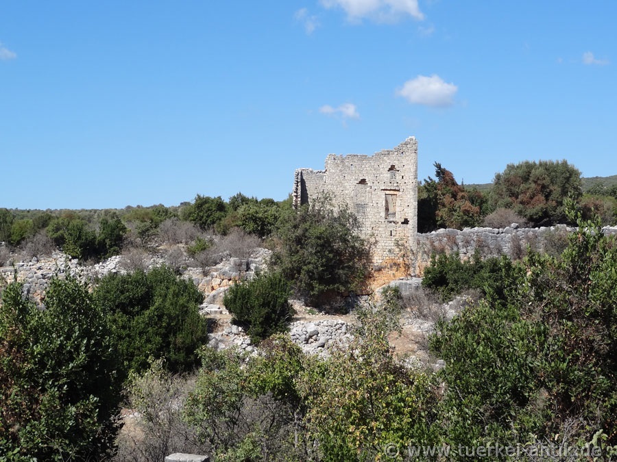 Etwa 60 Meter südlich des Turms stehen die Reste eines mindestens zweigeschossigen herrschaftlichen Wohnhauses aus frühbyzantinischer Zeit. Sein Eingang befindet sich auf der Nordwestseite, auf dem Türsturz ist ein Medaillon mit einem Kreuz eingearbeitet, das von zwei Pfauen flankiert wird. Im Inneren ist das Erdgeschoss durch einen Gurtbogen in zwei Teile aufgeteilt. |