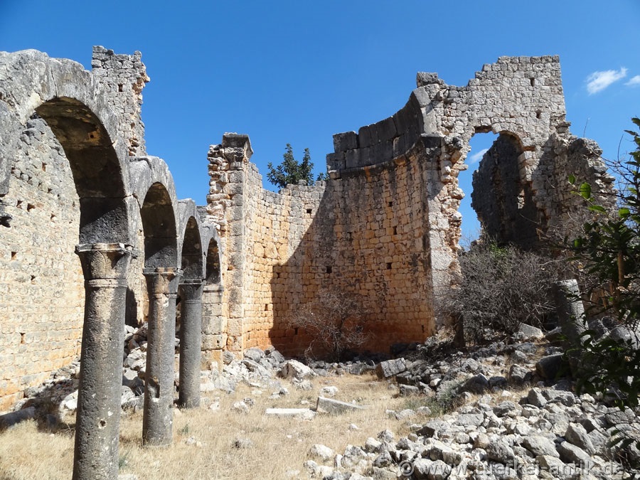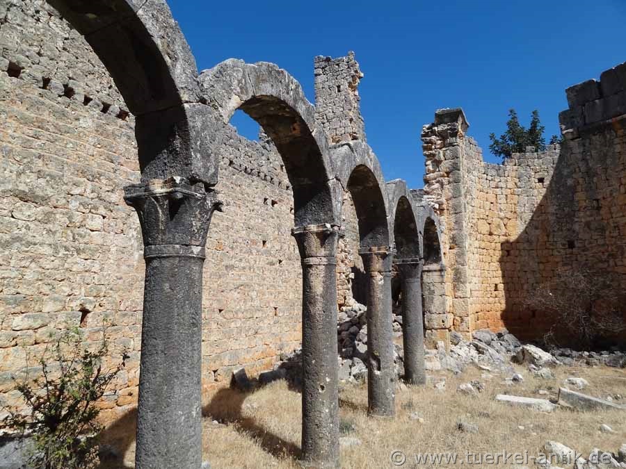 Die Seitenschiffe sind durch Säulenreihen mit Arkaden vom Mittelschiff getrennt. Am Boden liegen zwei herabgefallene Quader, auf denen eine Inschrift einen Georgios Paulos als Stifter angibt. Aus Balkenlöchern in den Wänden kann auf das Vorhandensein von Emporen über den Seitenschiffen geschlossen werden. |