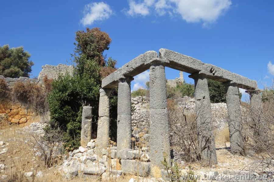 Unterhalb davon ist am Hang ein Peristyl zu sehen, von dem auf der Schmalseite drei und auf der Langseite vier unkannelierte dorische Säulen und der Architrav erhalten sind. Es hat vermutlich zu einem römischen Haus gehört. |