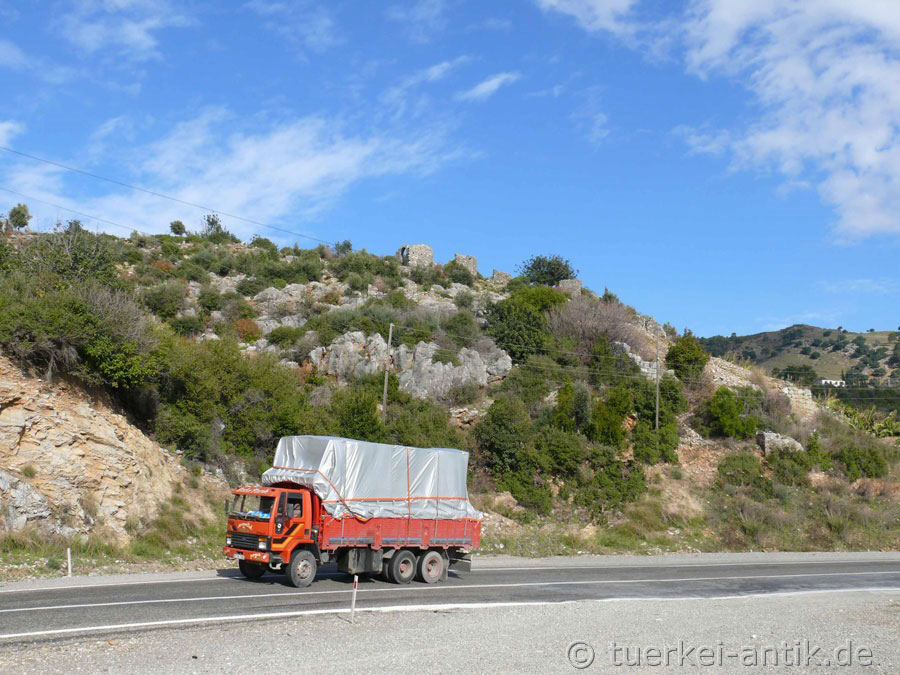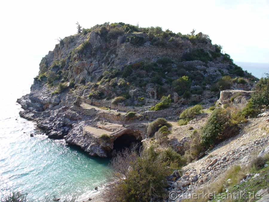 Nationalstraße D400 durchschneidet das einstige Stadtgebiet. Im vorbeifahren übersieht man fast die Mauerreste der einst wohl stolzen Stadt. Halten Sie auf der Meeresseite Ausschau nach dem gut sichtbaren Kale Restaurant, gleich danach sehen Sie die ins Meer ragende Felsnase der einstigen Akropolis. Die alte Nationalstraße D400 wurde ohne Rücksicht auf die historischen Funde durch die einstige Stadt gebaut. Das nahe am Flughafen Gazipasa vorbeiführende neue Teilstück der D400 berührt heute die Ruinen der Stadt nicht mehr. Dahingehende Befürchtungen, der Ausbau der Straße könnte noch mehr vernichten, haben sich zum Glück als nichtig erwiesen. |