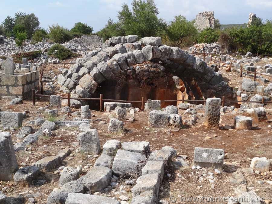 Bei einer Umrundung der Doline in Uhrzeigersinn folgen nach der Basilika I ein türkischer Friedhof und eine Zisterne aus hellenistischer Zeit. |