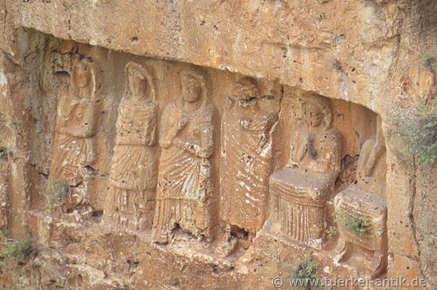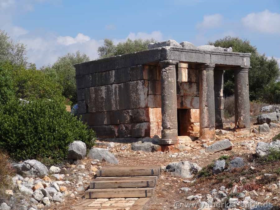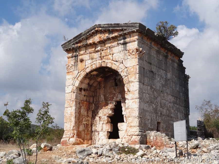 Etwa auf gleicher Höhe wie das Dreisäulengrab befindet sich weiter westlich das Tempelgrab der Aba, einer reichen Dame, die sowohl den Ehemann wie auch ihre beiden Söhne vermutlich im Kampf oder durch eine Seuche verloren hatte. Auf dem Torbogen war eine Inschrift angebracht, die sowohl den Namen der Stifterin wie auch den Ortsnamen "Kanytelleis" enthielt. |