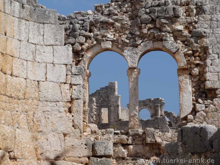 Entsprechend einer Stifterinschrift wird die im Nordosten der Doline gelegene dreischiffige Basilika 4 Papylos-Kirche genannt. Sie wurde Ende des fünften Jahrhunderts gebaut und ist die jüngste und am besten erhaltene Basilika von Kanytelleis. Die Wände sind zum großen Teil noch bis zu 8 Metern Höhe erhalten. |