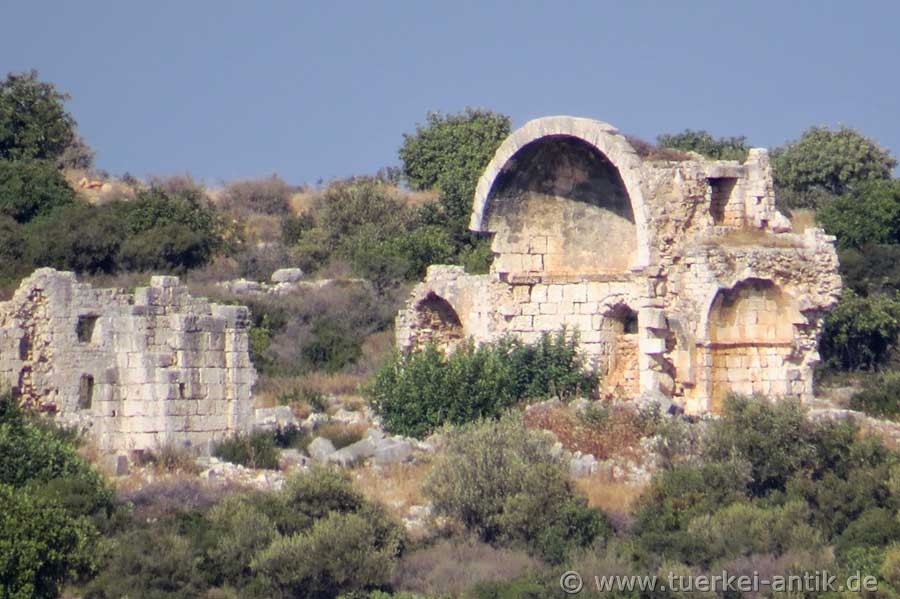 Von der bedeutenden Hafenstadt sind heute ausgedehnte, in großen Teilen stark überwachsene Ruinenfelder zu sehen. Dazu gehören zahlreiche Kirchen, Reste der Stadtmauer und drei weitläufige Nekropolen mit Felsengräbern und Sarkophagen. Als Ruinen erhalten sind die Land- und die Seeburg aus spätbyzantinischer beziehungsweise armenischer Zeit. Aus römischer Zeit sind nur wenige Gebäudereste vorhanden, in den christlichen Bauten und vor allem in der Landburg sind jedoch zahlreiche Bauteile aus früherer Zeit als Spolien verbaut. |