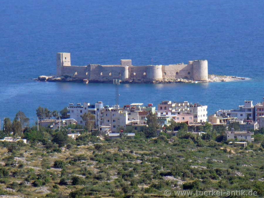Bekannter, sicher auch weil von weit her sichtbar, ist die Seeburg, die "Mädchenburg", nach der der heutige Ort seinen Namen bekam. (Kizkalesi = türkisch Mädchenburg) Auch diese Burg diente dem Schutz des Hafens. Eine Mole verband einmal beide Burgen. Um ihre Entstehungsgeschichte rangt sich die Sage, dass ein Sultan die Burg errichten lies um seine Tochter vor einem ihr prophezeiten Schlangebiss zu schützen. Der tödliche Biss ereilte die Tochter aber trotzdem, da die Schlange in einem Obstkorb auf die Insel gebracht wurde. Diese Sage hört man in der Türkei allerdings öfter, so auch um dem Mädchenturm im Bosporus bei Istanbul. |