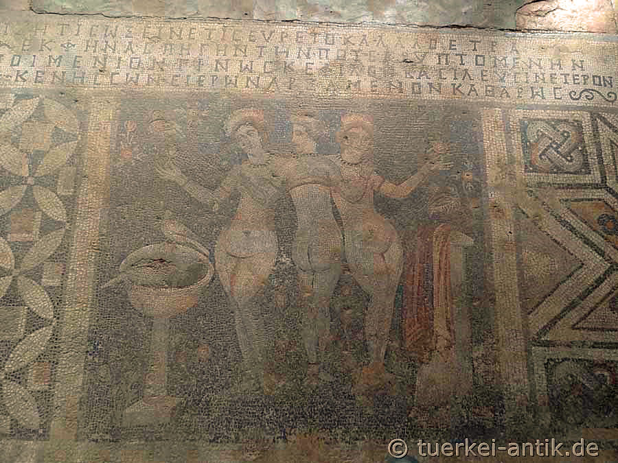 Das Mosaik besteht aus verschiedenfarbigen Mosaiksteinen (tessesae) und zeigt die drei Grazien, Euphrosyne (die „Frohsinnige“), Thalia (die „Blühende“) und Aglaia (die „Strahlende“) sowie ein Rebhuhn, Vögel und Blumen. Die vierzeilige griechische Inschrift über den Grazien lautet übersetzt: |