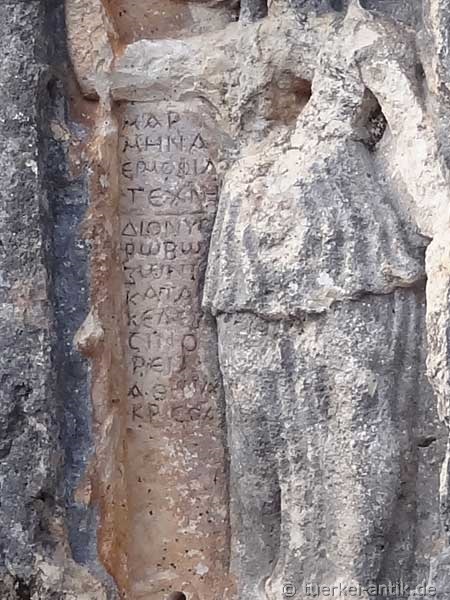 Zwischen der links gehaltenen Lanze und der Frauengestalt ist in einem schmalen Feld in 13 Zeilen die Inschrift eingraviert. Darin wird die Göttin als Αθηνα Κρισοα (Athena Krisoa) bezeichnet, wobei das von einem Ortsnamen abgeleitete Epitheton Κρισοα auf eine lokale Variante der Gottheit verweist; der zugehörige Ort Κρισοα konnte bisher noch nicht lokalisiert werden. Er dürfte sich aber sicherlich im Norden des Rauen Kilikien befunden haben. |
