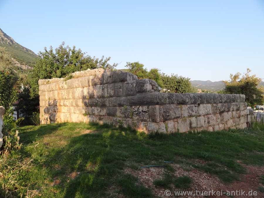 Es sind nur wenige Zeugnisse aus der bewegten Vergangenheit der Stadt erhalten. Westlich des heutigen Hafens befinden sich Reste der einstigen Seemauer, nördlich davon sind die Reste eines hellenistischen Tempels erhalten. Er wurde bereits in lykischer Zeit errichtet und in den darauffolgenden Jahrhunderten mehrmals restauriert und umgebaut. Man nimmt an, dass er Poseidon, dem Beschützer der Seefahrer geweiht war. |