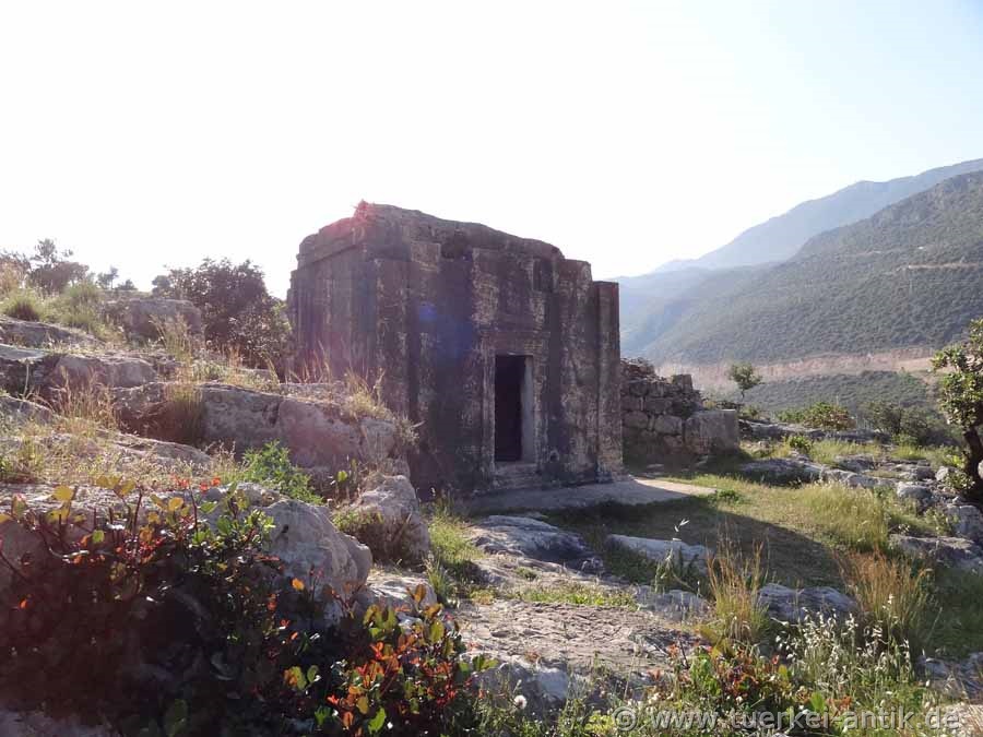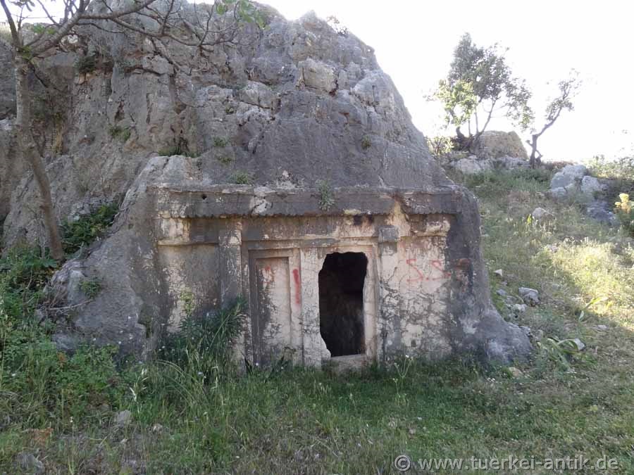 Umrundet man den Akropolishügel in westlicher Richtung, stößt man auf ein vollständig aus einem Felsen gehauenes dorisches Grabmal. (Foto) Bis auf kleine Beschädigungen im oberen Bereich ist das Grabmal vollständig erhalten. Wenige Meter unterhalb dieses Grabmals befindet sich ein lykisches Felsengrab mit einer Inschrift in lykischer Schrift über der Türöffnung. |
