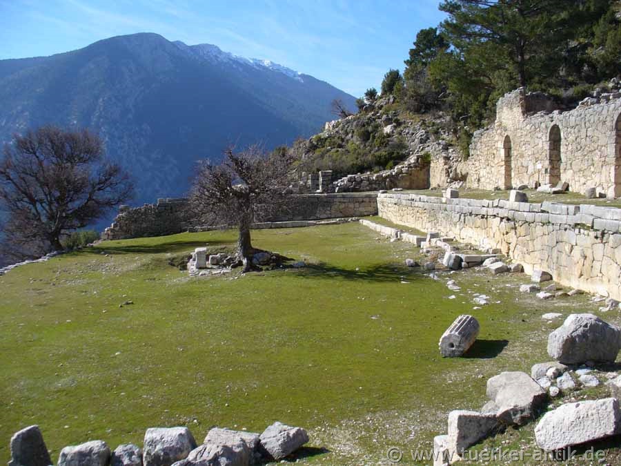 Arykanda liegt an der Straße zwischen Finike und Elmalı, 32 km nördlich von Finike. Die Ruinen der antiken Stadt liegen auf Terrassen an einem Steilhang zwischen 710 und 820 Höhenmetern. Die Anlage bietet von allen Terrassen einen weiten Blick auf die umliegenden Berge und ins Tal. Diese dem antiken Delphi ähnliche Topografie hat dem Ort die Bezeichnung „Delphi Lykiens“ eingetragen. |