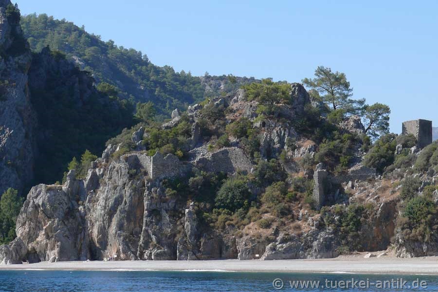 Lange Zeit war Olympos völlig vergessen. Die Stadt war durch einen Bachlauf in zwei Hälften geteilt. Die Reste einer Brücke sind noch auszumachen. Leider sind die noch bestehenden Bauten, wie z.B. ein kleines römisches Theater, die Reste eines Tempels aus dem 2. Jh. v. Chr. sowie eine Basilika aus byzantinischer Zeit stark verfallen und weitgehend überwuchert. Unübersehbar ist die Nekropole mit zahlreichen Gräbern, die jedoch nicht alle lykischen Ursprungs sind. |