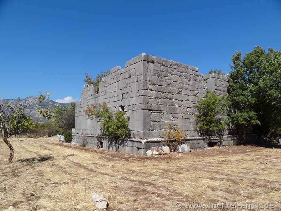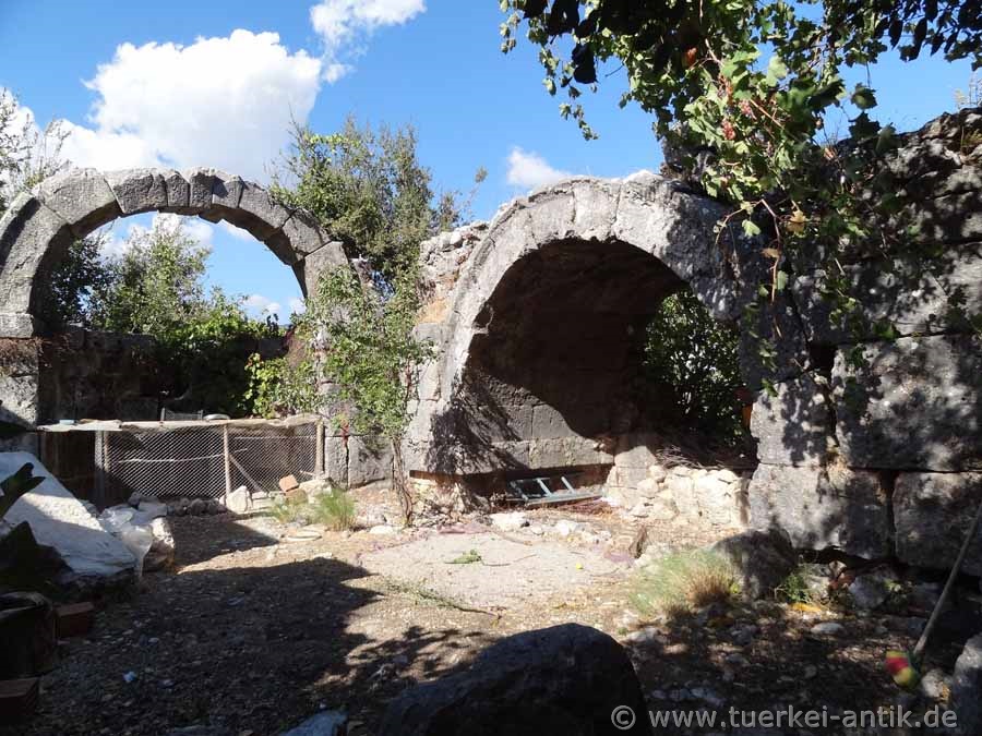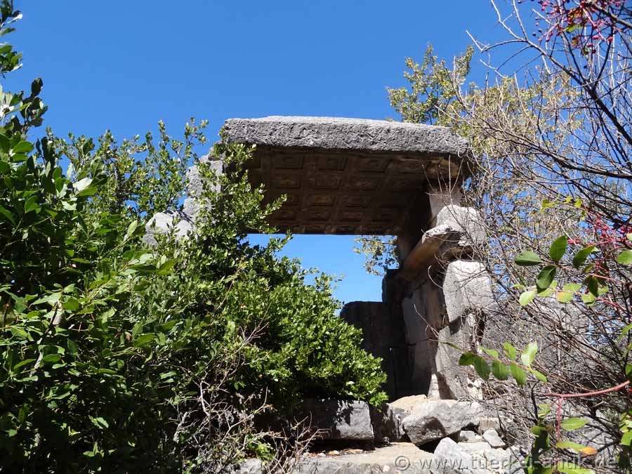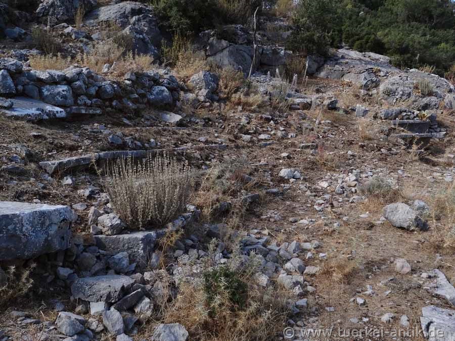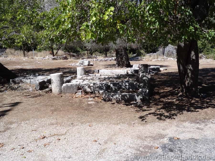 Sie erreichen Sidyma aus Richtung Antalya/Kalkan kommend über die Nationalstraße D400. Beim Dorf Gölbent führt gleich nach einer langgezogenen Kurve links eine braun ausgeschilderte Straße nach Sidyma ab. Der weitere Weg ist ausgeschildert, allerdings ist an Abzweigungen Aufmerksamkeit erforderlich, da nicht alle Schilder gut sichtbar sind. Achten Sie auch auf die Ausschilderung nach Doduga. Das ist das Dorf auf dem ehemaligen Stadtgebiet von Sidyma. An der Moschee können Sie gut parken und mit der Besichtigung beginnen. Von Fethiye kommend fahren Sie erst auf der Nationalstraße D400, Richtung Antalya. Ca. einen Kilometer vor der Ortschaft Eşen zweigt rechts eine braun ausgeschilderte Straße nach Sidyma ab. Der weitere Weg ist ausgeschildert, allerdings ist an Abzweigungen Aufmerksamkeit erforderlich, da nicht alle Schilder gut sichtbar sind. Achten Sie auch auf die Ausschilderung nach Dodurga. Das ist das Dorf auf dem ehemaligen Stadtgebiet von Sidyma. An der Moschee können Sie gut parken und mit der Besichtigung beginnen. |