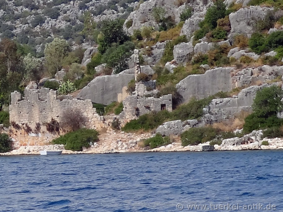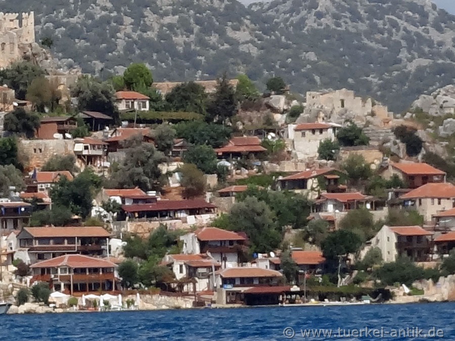 Auf den Resten der antiken lykischen Stadt Simena befindet sich heute das Dorf Kaleköy (türkisch für "Burgdorf" Der Ort ist auch heute noch nur zu Fuß oder mit dem Boot erreichbar. |