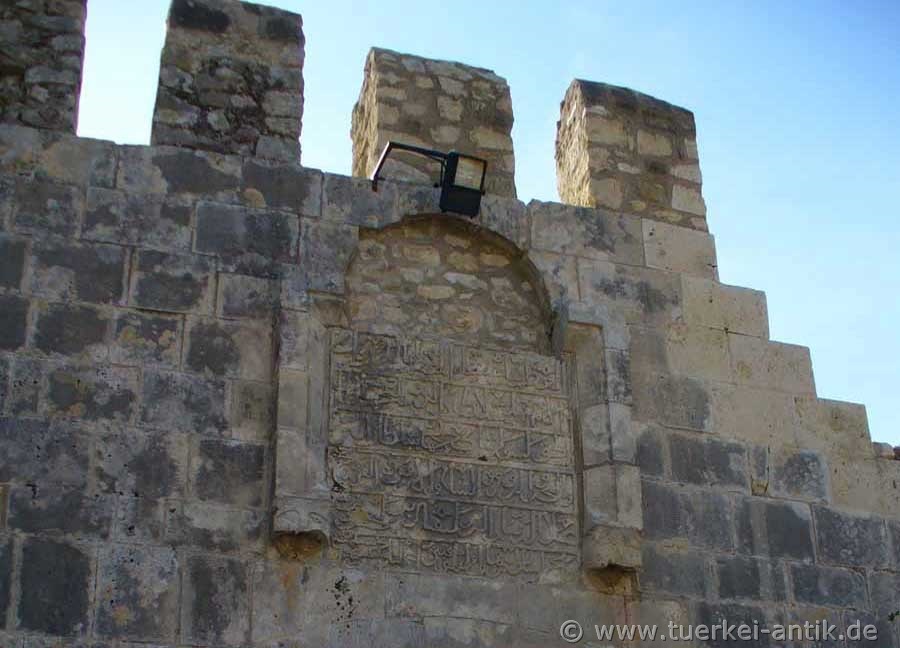 Den Bauherrn rühmt die Inschrift über dem Portal: "Es befahl den Bau dieses gesegneten Han der erhabene Eigentümer der Nacken der Völker, Herr der Sultane über Gläubige und Ungläubige, der Ländereroberer der Welt, Sultan über Land und Meer, über Rum, Syrien, Armenien und Franken, Alaeddin Keykubat" (Hans E. Latzke: Die Türkei - Die Südküste, Ostfildern 2005)