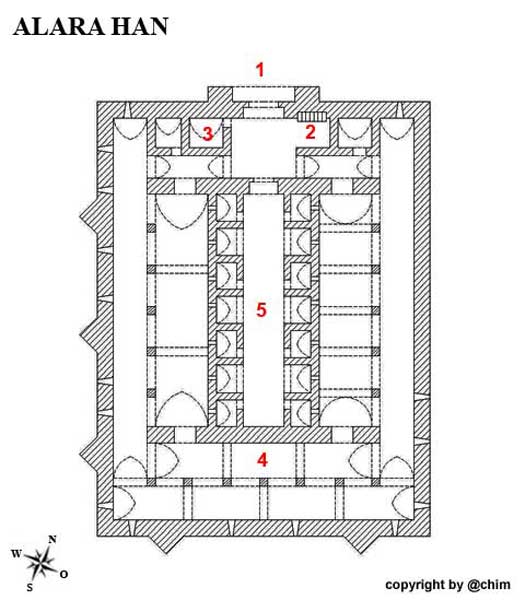 Die Konstruktion dieses 34,5 x 45 m großen Han ist als außergewöhnlich zu bezeichnen. Der festungsähnliche Charakter ist unverkennbar. Anhand der Größe und der für die Zeit der Erbauung ausgesprochen luxuriöse Innenausbau nährt die These, dass dieses Gebäude als Archiv, Schatzhaus und als Unterkunft für den Sultan selbst errichtet wurde, wenn dieser die Festung und Stadt Alanya besuchte.