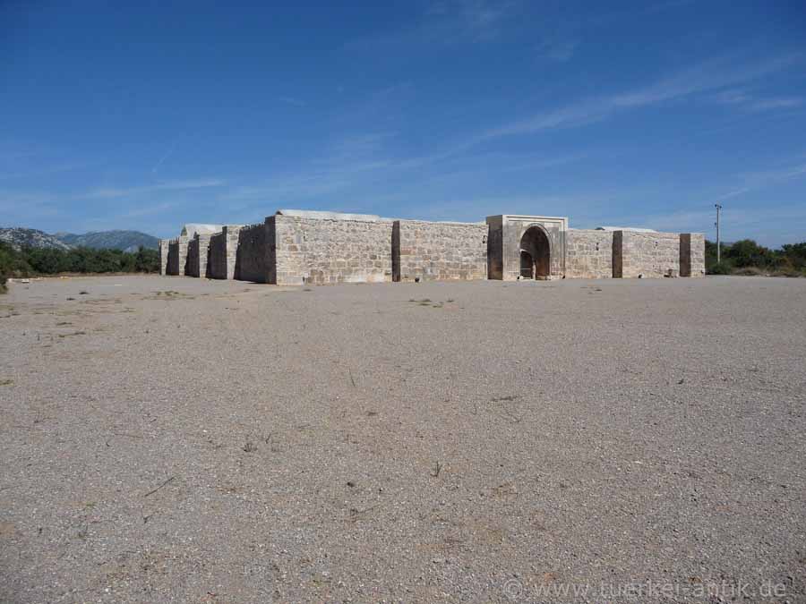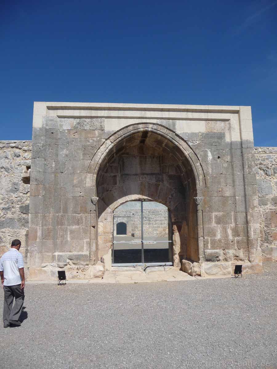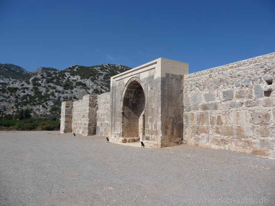 Der Kirkgöz Han ist eine alte seldschukische Karawanserei, ca. 35 km von der Altstadt Antalya entfernt. Der Han wurde im Jahre 2008 komplett renoviert und instandgesetzt. Leider ist er seither für Fremde nicht mehr zugänglich. Das Innere kann man lediglich durch das mit Plexiglas verkleidete Eingangstor erahnen. |