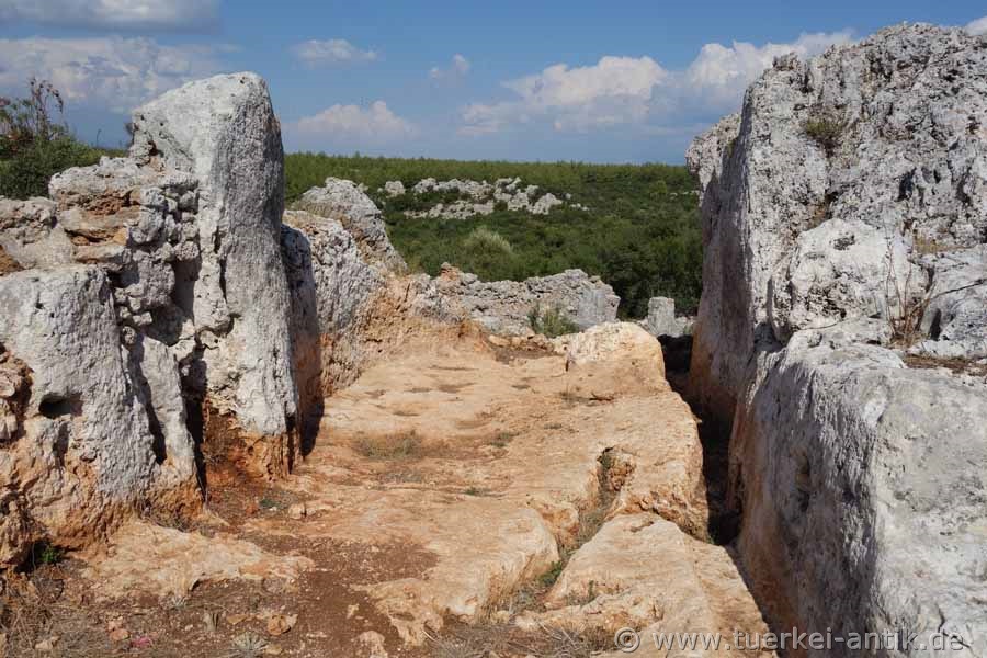 Im Nordwesten des Gebäudes befindet sich eine riesige, 19,90 x 5,40 Meter große Zisterne. Sie wurde komplett aus dem Felsen herausgearbeitet. Eine stirnseitig erhaltene Mauer sowie die seitlich erhaltene Abschlußkante zeigen, dass die Zisterne mit einem Tonnengewölbe überdacht war. Durch einen in situ erhaltenes, 2,70 x 0,50 Meter messendes Bauteil ist ersichtlich, dass sich der Zufluss in der südwestlichen Ecke befand. |
