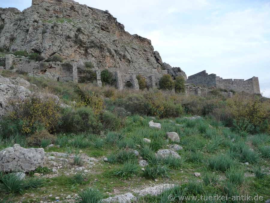 Von einer Toranlage mit zwei Wehrtürmen führt eine Rampe zu einem weiteren Tor auf dem Plateau. Sie wird von einer hellenistischen Mauer gestützt. Diese Rampe war nötig geworden, um die wachsende hellenistische Stadt auf dem Plateau mit Fuhrwerken erreichen zu können. Für diese Rampe war die Stadt in der antiken Welt berühmt. |