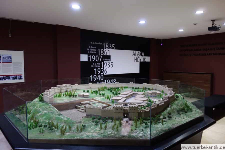 Die auf Weisung Mustafa Kemal Atatürk' am 15. April 1931 gegründete Türkische Historische Gesellschaft (Türk Tarihi Tetkik Cemiyeti) begann im Jahr 1935 unter der Leitung von R.O. Arik mit den ersten nationalen Ausgrabungen in Alacahöyük. Die entdeckten Artefakte wurden in einer Halle im Dorf Alacahöyük gelagert und ab 1940 ausgestellt. 42 Jahre später, 1982, wurde das Alacahöyük-Museum an den heutigen Standort, direkt neben dem Ausgrabungsgelände verlegt. Die Funde sind außer im Alacahöyük-Museum im Museum für anatolische Zivilisationen in Ankara und im Archäologischen Museum Çorum ausgestellt. |