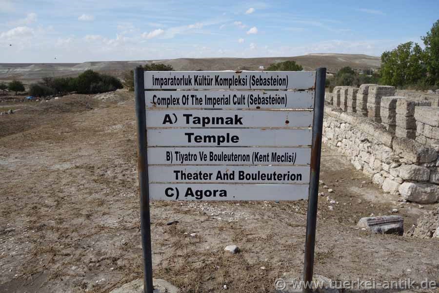 ein Sebasteion, erreichbar über eine zentrale Treppe mit zwei Cavea-Flügeln die als Theater genutzt werden konnte, wo religiöse und andere Aufführungen wie Gladiatorenkämpfe stattfanden.