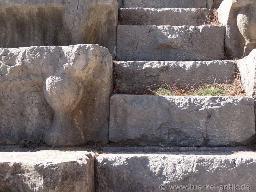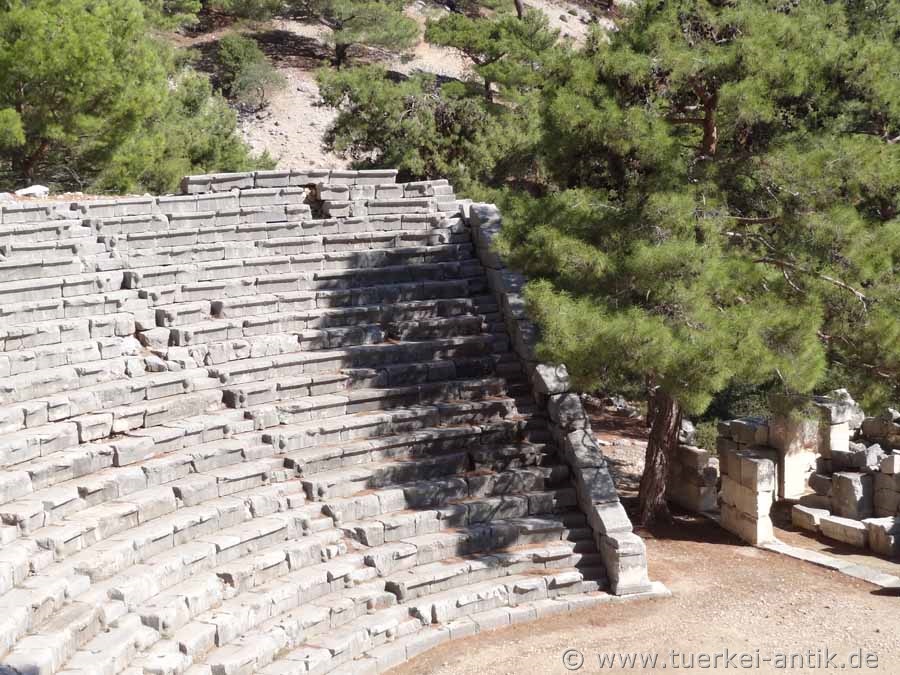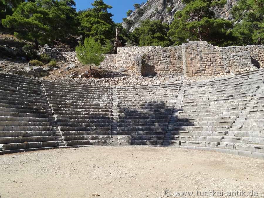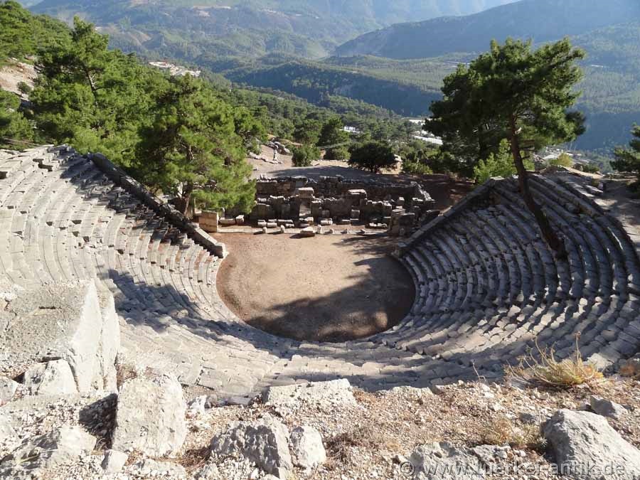The (Greek) theatre of Arykanda dates back to the 2nd century B.C. The cavea was beaten directly into the mountain below the stadium. It has 20 rows of seats, which are completely preserved. The stage house is 26 m wide. |