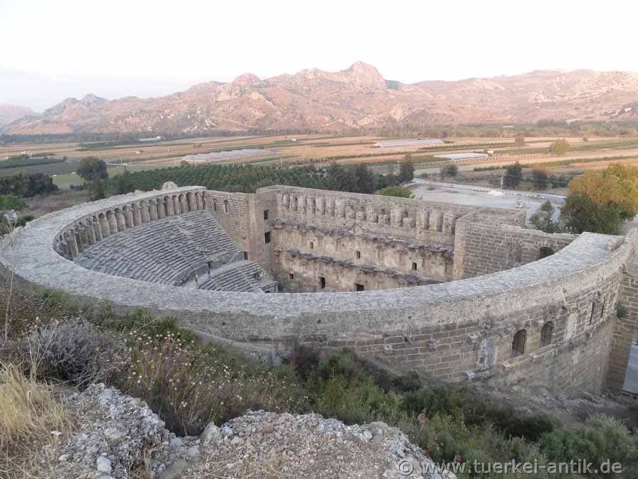 The theatre of Aspendos is of Roman origin. The stage house has been preserved at its full height and, together with the theatres in Orange (southern France) and Bosra (Syria), is thus one of the last three ancient theatres with a fully intact stage house.