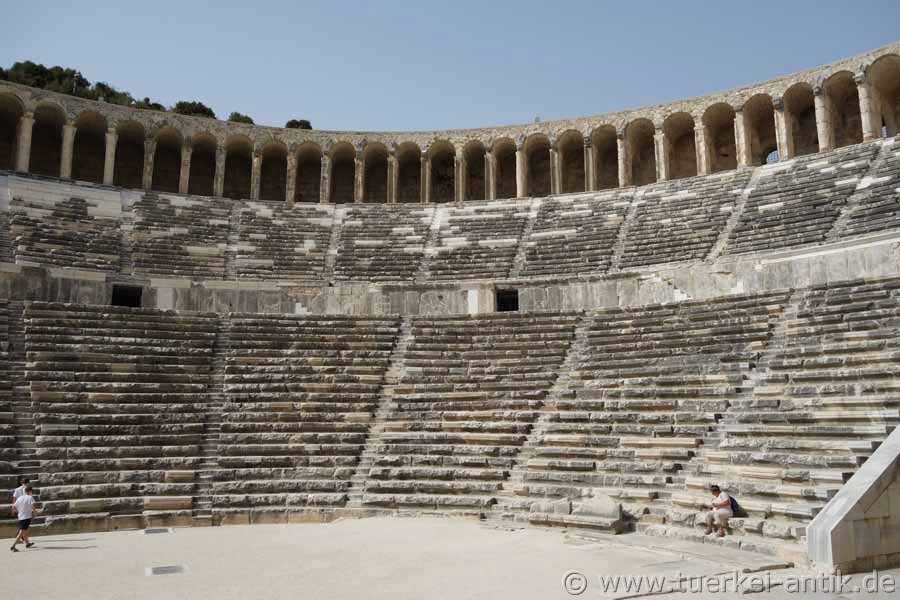 Below the crown of the wall, the entrances can still be seen, on which an inclined wooden construction rested, which spanned the stage and provided even better acoustics. The cavea has 39 rows of seats divided by a diazoma. Since the Seljuks used the theatre as a caravanserai in the Middle Ages, it was continuously repaired and repaired after earthquakes. This explains the good state of preservation compared to other theatres of that time.