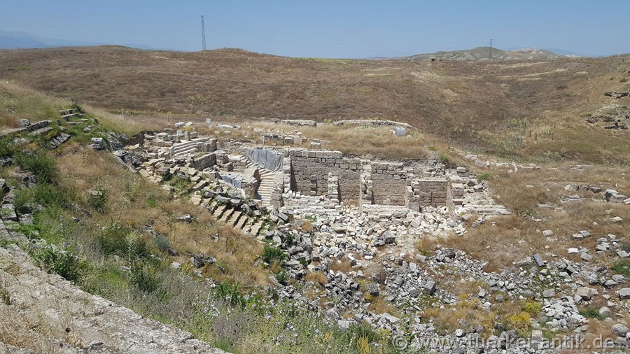 The smaller, originally Hellenistic theatre was built completely in the slope of the city hill. The stage house had a height of 6-7 meters. |