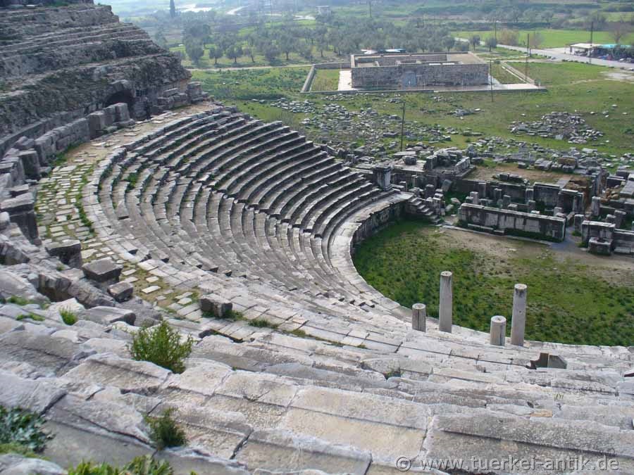 The city of Miletus shared the same fate as the cities of Herakleia on Latmos, Magnesia ad Maeandrum and Priene, they were founded in the wrong place. What nobody could know was that the river Mäander (Turkish: Büyük Menderes), due to the large quantities of sediments that it had always carried with it, slandered the entire Gulf, so that Herakleia became a place on an inland lake and Priene now lies far inland. Miletus itself lay on a promontory that protruded into the then existing Gulf. Milet gained its economic importance through its four ports, which were located in the usable bays around the headland. According to tradition, Miletus was re-founded in 1053 BC by Ionic colonists. From the 8th century BC onwards, Miletus developed into an important transhipment point for trade with the Orient through the four ports. Purple fabrics from Miletus as well as other textiles, but also wool and olive oil were coveted trade goods. Miletus became one of the most important Greek cities and at times ruled the Aegean Sea. Miletus founded over 80 colonies. Miletus was called the Head of Ionia because of its extensive trade activities and the number of its colonies. In the 7th century BC, the Greek cities on the west coast of Asia Minor came into conflict with the neighbouring empires of the Lydians and later the Persians. In the 6th century BC the city was first subdued by the Lydian king Kroisos, then by the Persians under Cyrus II. An uprising of the Ionian Greeks against the Persian Empire (Ionian uprising), starting from Miletus, failed. Miletus was conquered and destroyed by the Persians in 494 BC. The reconstruction of Miletus was carried out according to the ideas of Hippodamos of Miletus. Until the Alexander campaign the city was under Persian supremacy in the 4th century BC. In Hellenistic times different powers ruled in Asia Minor, thus also over Miletus. 133 B.C. Miletus was bequeathed to Rome together with the kingdom Pergamon and became part of the Roman province Asia. Miletus remained of secondary importance in the following period, as the Romans chose Ephesus as the capital of their province Asia. Nevertheless, numerous representative buildings were erected in Miletus during the imperial period. Like Ephesus, there was an early Christian community in Miletus. The New Testament reports in Acts that the Apostle Paul, on his last missionary journey before returning to Jerusalem, said goodbye to the leaders of the church in Ephesus. In late antiquity, i.e. between 280 and 560 AD, there was a sharp decline in population. To protect it from enemy raids, the great theatre was fortified and provided with a fort at the highest place to protect it. Houses were built in the auditorium. During this time Miletus was of particular importance as a bishop's seat. In Ottoman times, the princes of Menetsche temporarily chose their seat in Miletus and left numerous representative buildings. An example of this is the excellently preserved Ilyas Bey Mosque near the Faustina Baths. In the following years it became quiet around Miletus. Until a severe earthquake in 1955 there was a village called Balat on the ruins. After the earthquake, the settlement was moved to the south, outside the city area. |