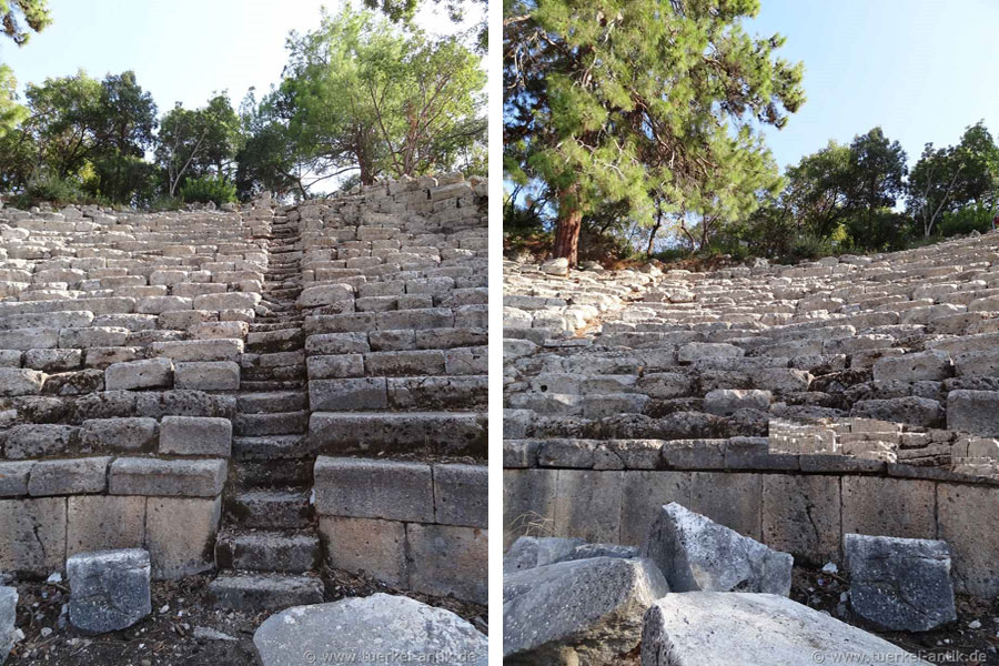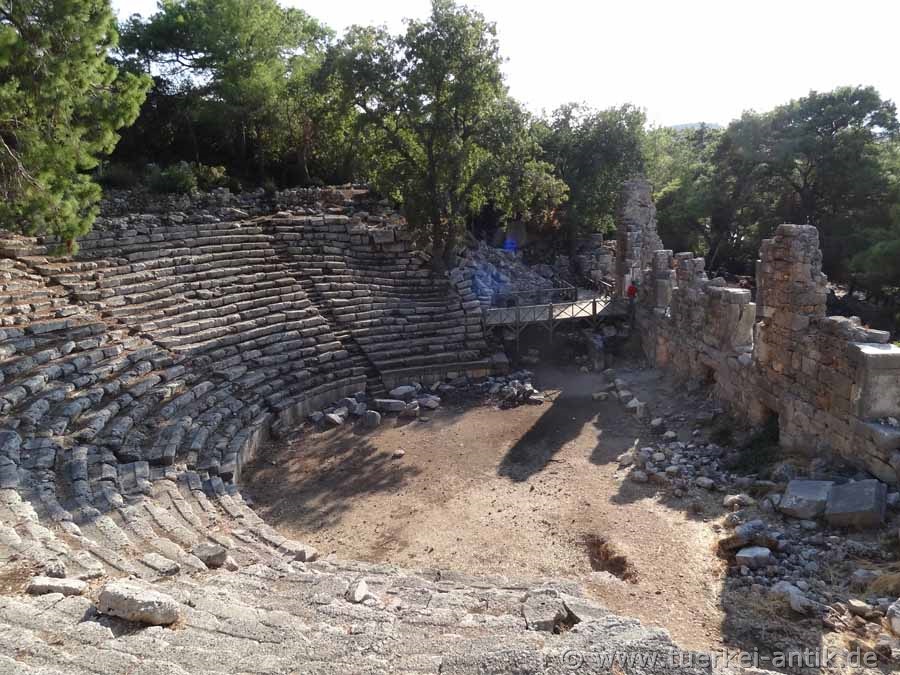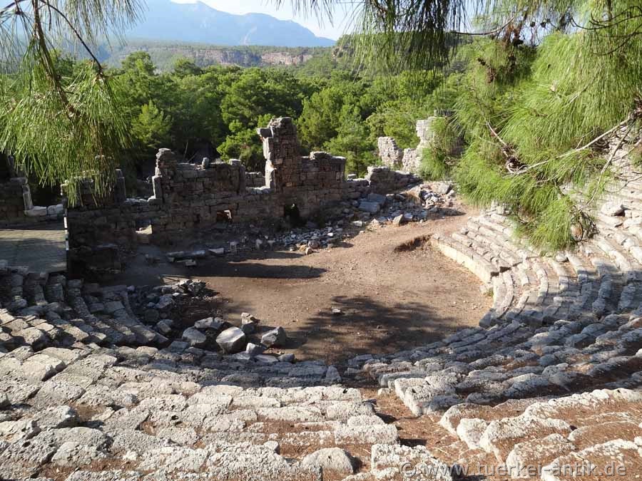 According to sources, the town was founded around 690 BC as a Rhodian colony. It belonged to the Persian Empire for a long time from about 550 B.C. - a position that was culturally and economically important for many small Asian Greek cities. Politically, however, this was used as a pretext in Athens to camouflage the Athenian activities of the Attic Sea Alliance as an anti-Persian combat alliance. After 411 B.C. again Persian, Phaselis surrendered to Alexander the Great in 333 B.C.. During the Wars of the Diadochi it was first Ptolemaic (until 197 B.C.) then Seleucidal (until 187 B.C.). Although it belonged to Pamphylia, it was incorporated into the Lycian League under Roman rule until about 100 B.C.. The city flourished during the Roman period, when it was known as a flourishing commercial centre. From here, wood, rose oil, perfumes and fragrant creams were exported. Although Phaselis was until Byzantine times a naval and trading base with some prosperity, today's building stock is not very impressive. The Seljuks had used the city as a quarry for the extension of Antalya's fortifications. A theatre, an aqueduct and a boulevard running across the peninsula between the former galley port and the commercial port have been preserved. The city's acropolis has not yet been excavated. |