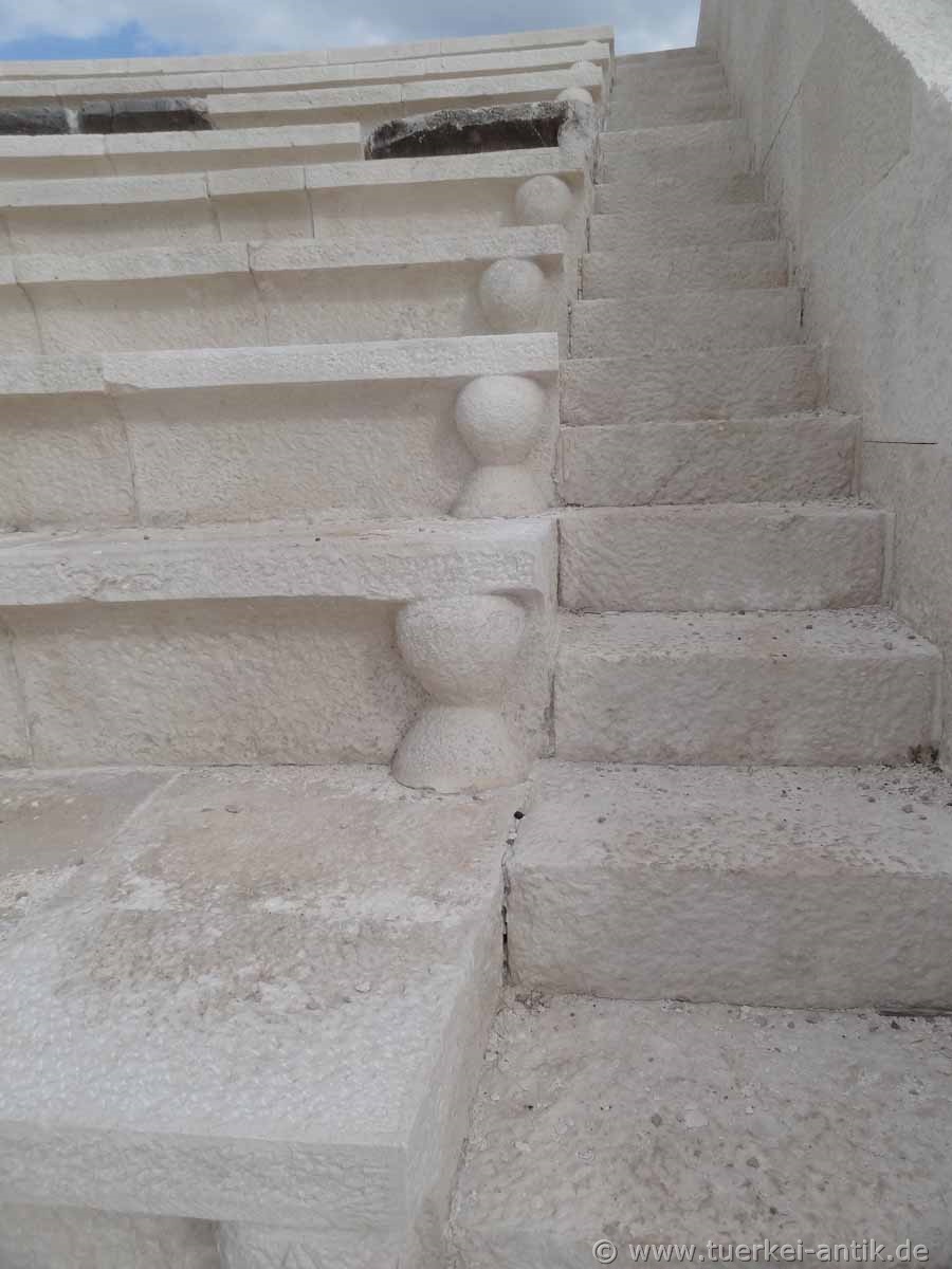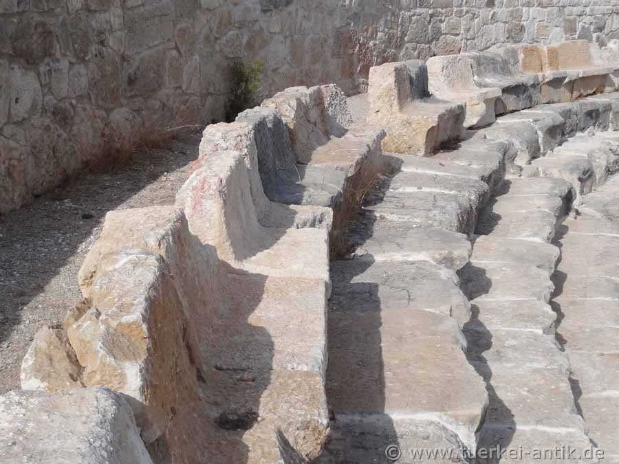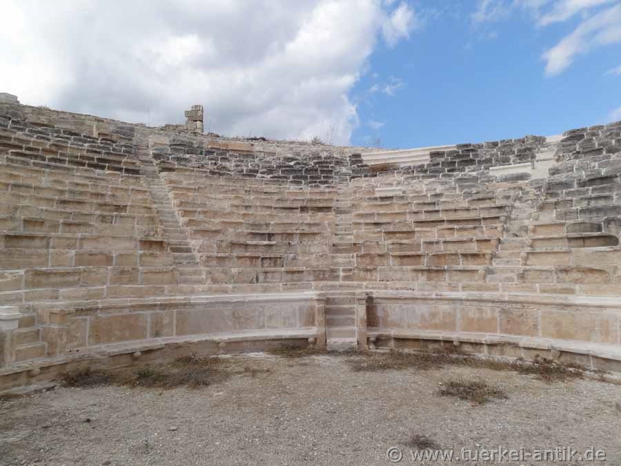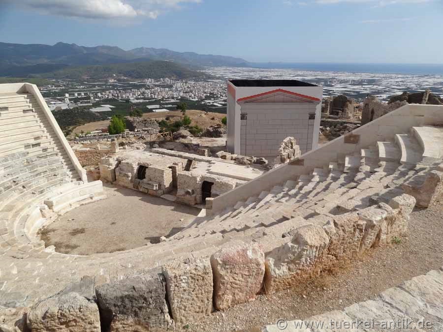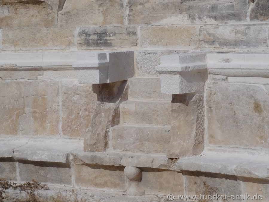 The (Greek) theatre of Rhodiapolis was probably built at the end of the 1st century BC and expanded in Roman times. The stage house was undoubtedly built during the Roman Empire. The devastating earthquake of 141 AD also affected Rhodiapolis and the theatre. The Euerget Opramoas of Rhodiapolis, one of the richest men in the ancient world, had - according to the inscriptions immortalised on his mausoleum - donated considerable sums of money for the reconstruction of the destroyed Lycian cities. This was also the case for the restoration of the theatre in his hometown. On the square in front of the theatre, a mausoleum was erected for him, with inscriptions on its outer wall testifying to his generosity and thus remaining in the memory of posterity. |