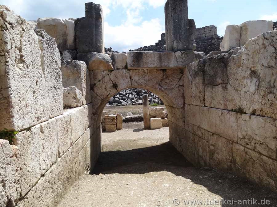 The Roman theatre of Tlos, which stands freely in a plain, was built around the turn of time according to an inscription found, presumably under the Roman emperor Augustus (31 BC - 14 AD). As recently discovered during the excavations of the Limyra Theatre, the cavea of the Tlos Theatre was erected on a vaulted structure with a circumferential vault, similar to that of the Side Theatre. The stage house has been completely destroyed. The theatre, like the entire city and several other cities of the Lycian League, was destroyed by a devastating earthquake in 141 AD. The Euerget Opramoas of Rhodiapolis also donated a considerable sum for the reconstruction of the theatre of Tlos. |