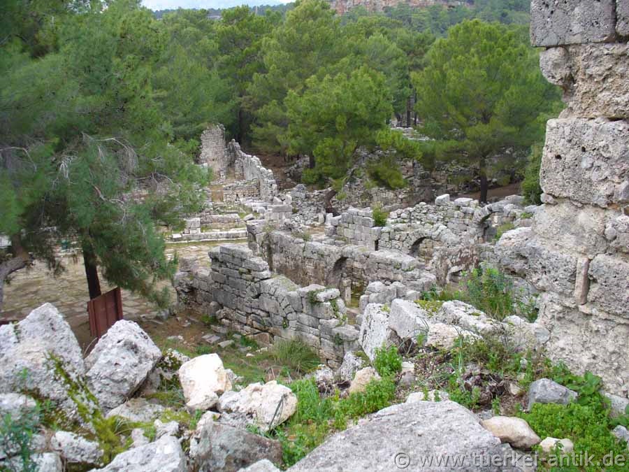 Die Theater-Therme in Phaselis, auch "Kleines Bad" genannt, befindet sich auf der Ostseite des zentralen Marktplatzes, unterhalb des Theaters. Anhand der Ausführung des Hypocaustsystems lässt sich seine Entstehungszeit in die Zeit um das 1. Jh. n. Chr. datieren. Es wird angenommen, dass es sich um ein Privat-Bad handelte, also der breiten Öffentlichkeit nicht zur Verfügung stand. Das große, öffentliche Bad mit direktem Anschluß an den Aquädukt befand sich in ca. 50 Meter Entfernung auf der Westseite der Hauptstraße. |